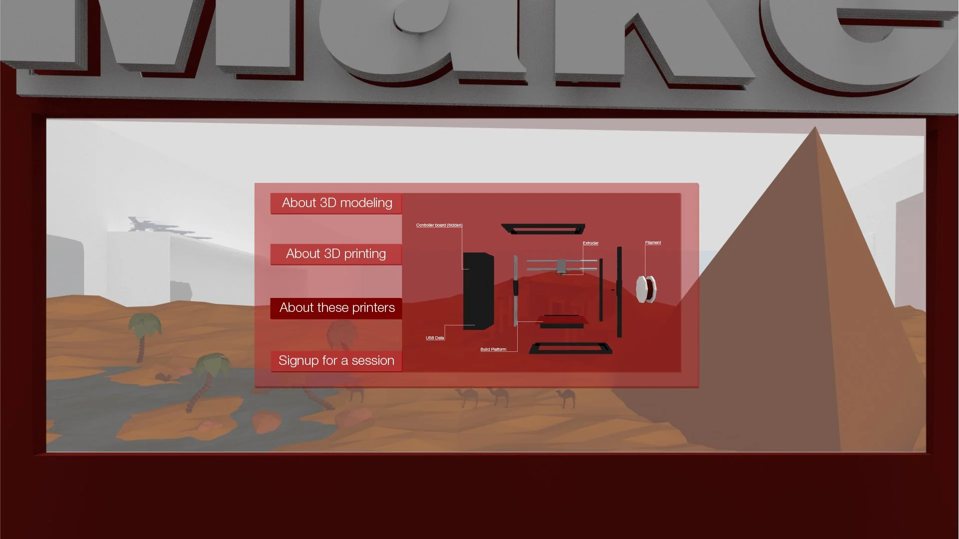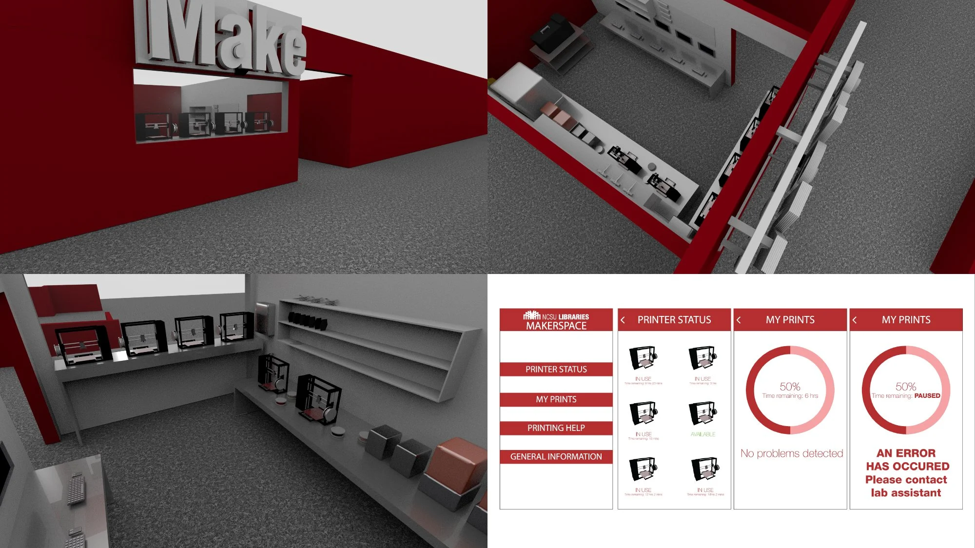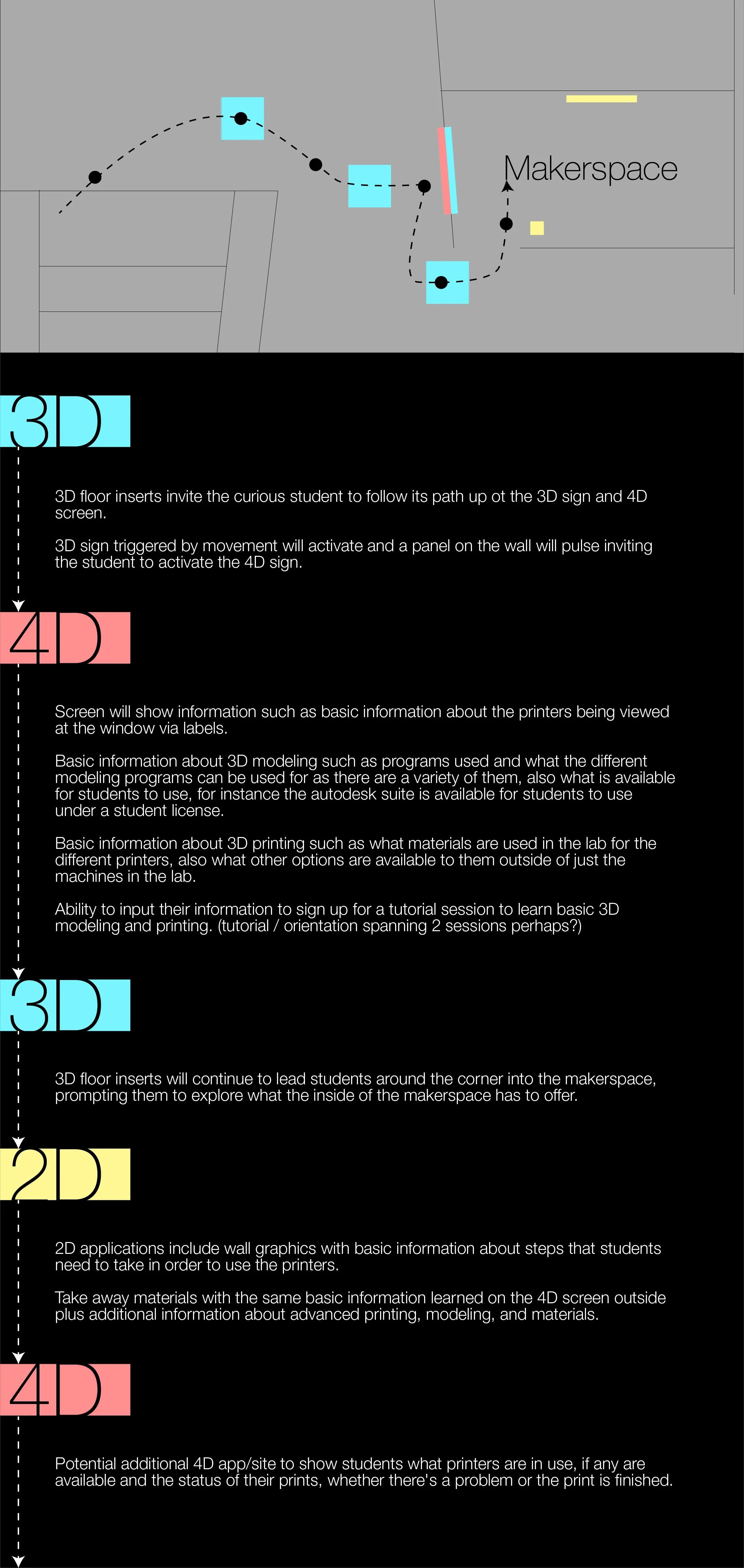 For this semester-long project we chose a space that existed in one of two of our university libraries. The prompt was to choose a space in the library and come up with a new way for users to experience said chosen area, utilizing two-, three-, and four-dimensional media. The following shows the progress of workshops done throughout the semester, turning the Makerspace as it is now from a place where students just give lab assistants their files to be 3D printed, to a place that students can go learn to 3D modeling as well as 3D print for themselves. The final user experience includes inlaid 3D printed pieces in the floor leading from the staircase to the door of the makerspace showcasing what can be done with 3D printing, a sign activated by movement, an interactive screen which shows users basic information about the makerspace also activated through movement, an app that gives users basic information about the status of printers that are in use in the lab as well as their prints and 2D information on the wall instructing users about how to use the printers.